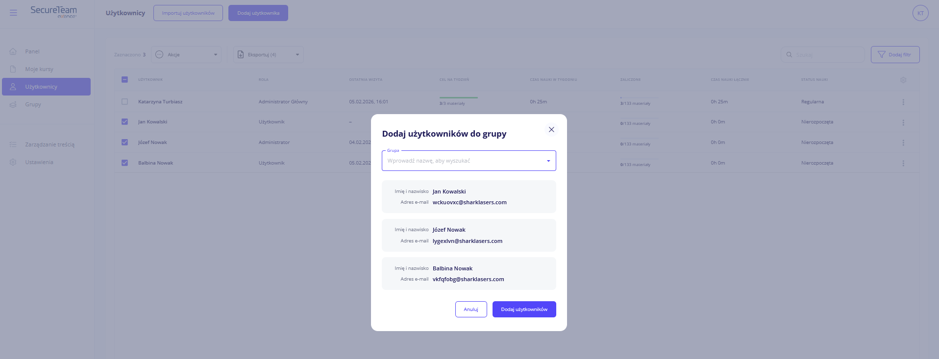 Zamiast dodawać do grupy czy usuwać poszczególnych użytkowników, możesz skorzystać z akcji zbiorowych.