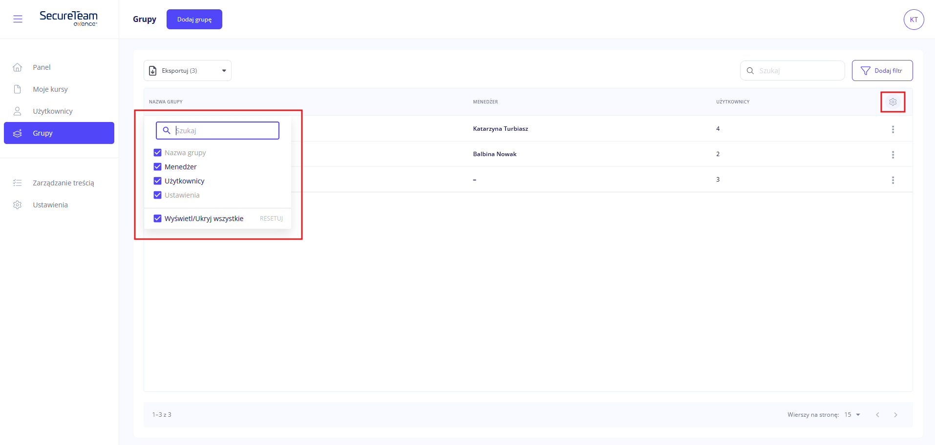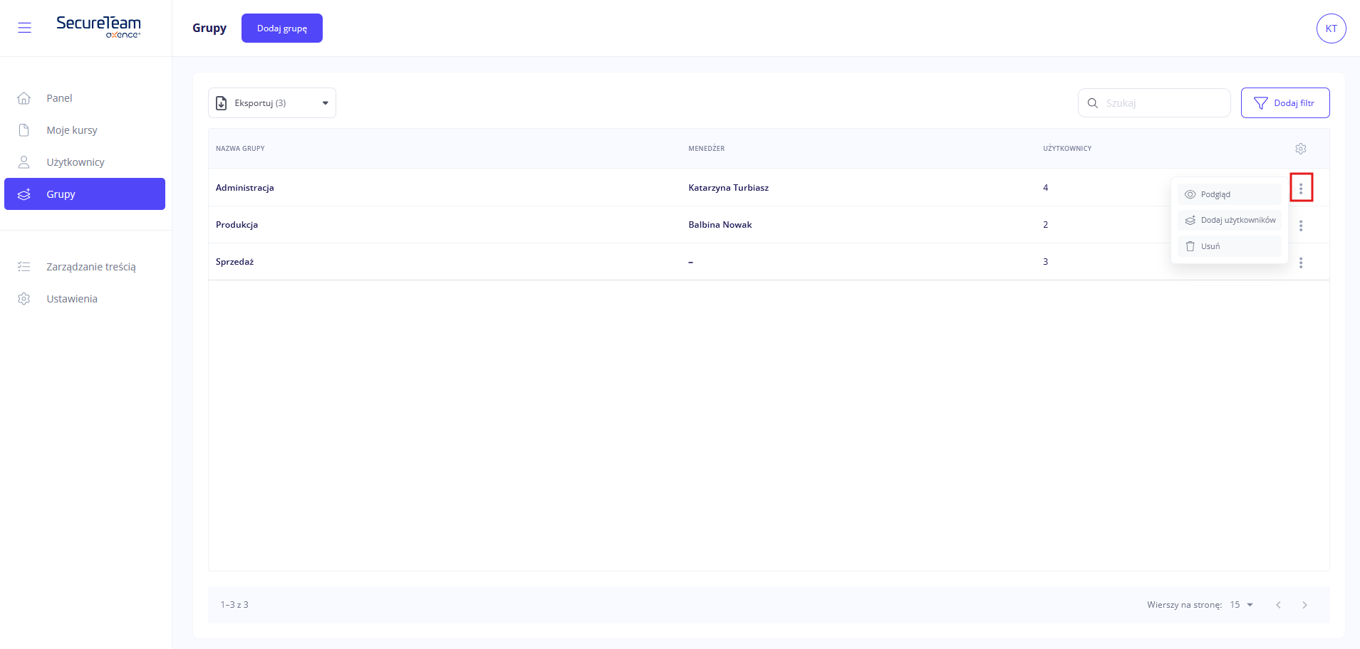 - masz możliwość podglądu i usunięcia każdej z grup, a także dodania do niej użytkowników,