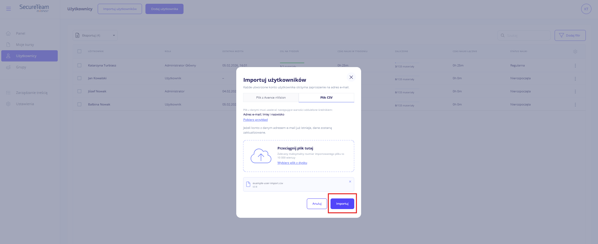 - kliknij w przycisk Importuj użytkowników,