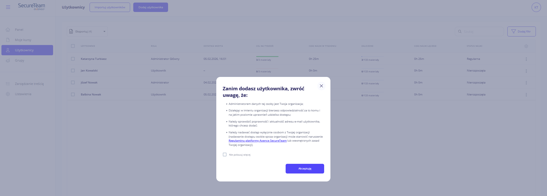 Import to jeden z dwóch sposobów na dodanie użytkowników do organizacji w Axence SecureTeam.