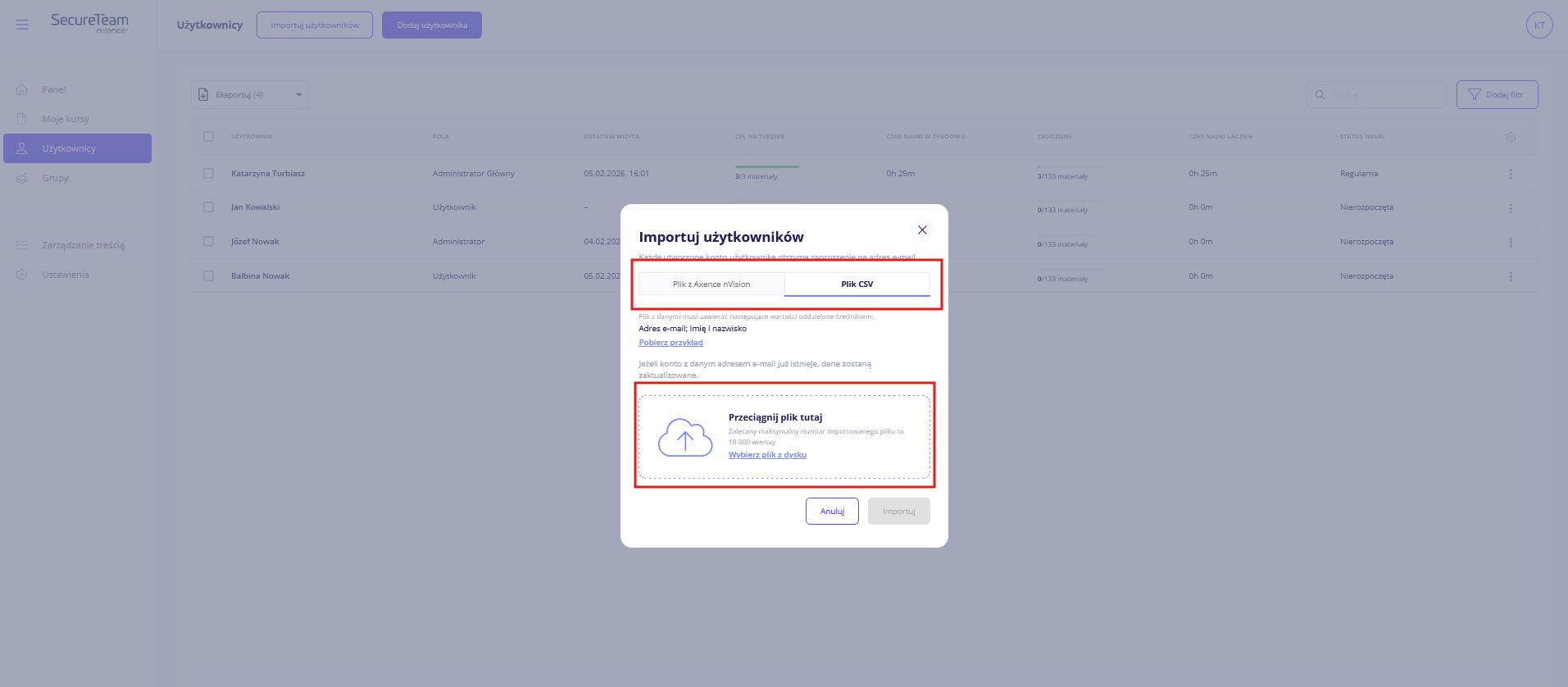 - prawidłowy format, tzn. nie można zaimportować użytkowników plikiem o innym formacie niż .CSV,