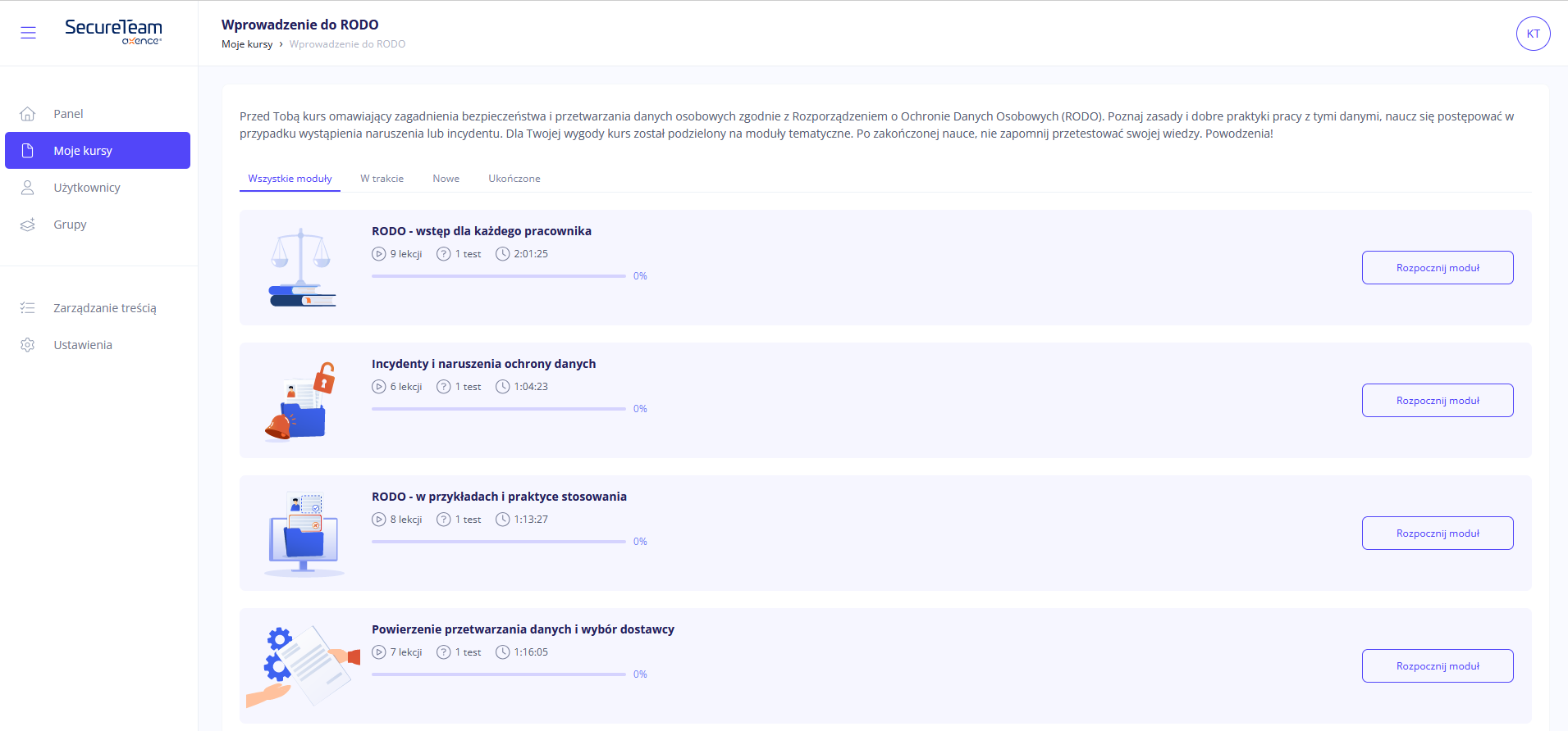 Dostępne kursy zostały zaprojektowane tak, by dać jak największą swobodę i wolność wyboru użytkownikom. Wszystkie materiały są od razu dostępne dla każdego użytkownika, a kolejność nauki i zawartość modułów to jedynie sugestia ze strony autorów kursu. Jako użytkownik możesz zapoznawać się z całą zawartością szkolenia w dowolnym porządku, wybrać jedynie najbardziej interesujące materiały czy też przystąpić do testu.