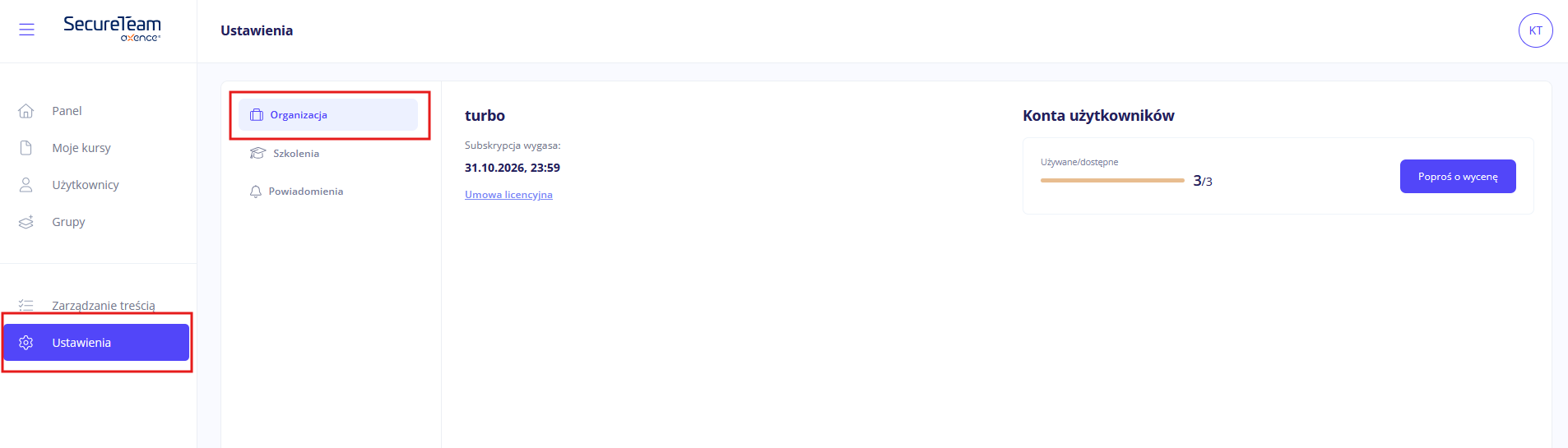 Jako Administrator masz dostęp do szczegółów subskrypcji danej organizacji. Możesz je obejrzeć w sekcji Organizacja z zakładki Ustawienia.