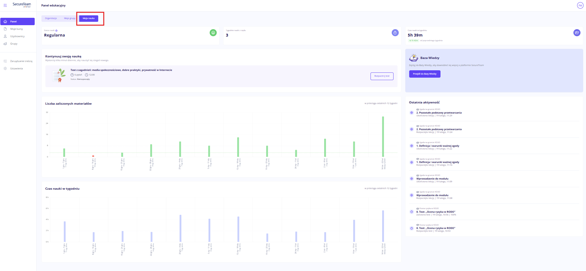 Swój postęp w kursie możesz obejrzeć w zakładce Panel.