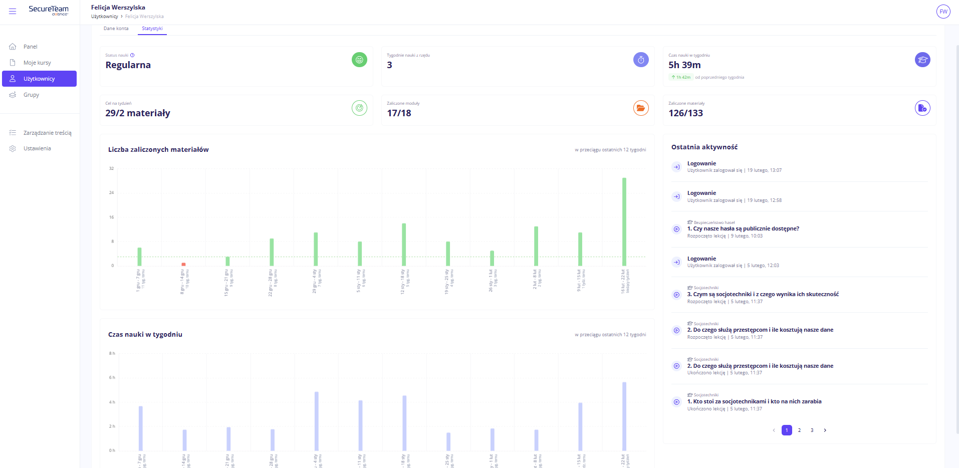 Platforma Axence SecureTeam na bieżąco monitoruje oraz zapisuje dane dotyczące Twoich postępów w nauce.